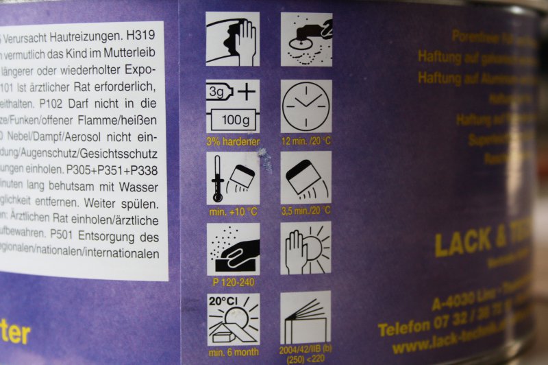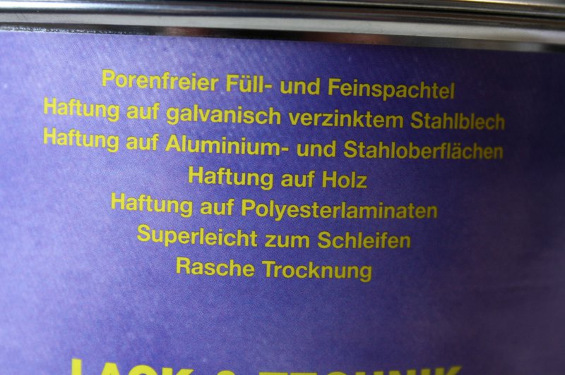 Preis: 41,99 EUR inkl. gesetzl. MwSt. zzgl. Versand Artikelnr.: 81028 Lagerbestand: 0 Gewicht: 1,20 kgPorenfreier Füll- und Feinspachtel Haftung auf Galvanisch verzinktem Stahlblech Haftung auf Aluminium und Stahloberflächen Haftung auf Holz Haftung auf Polyesterlaminaten Superleicht zu schleifen rasche Trocknung
