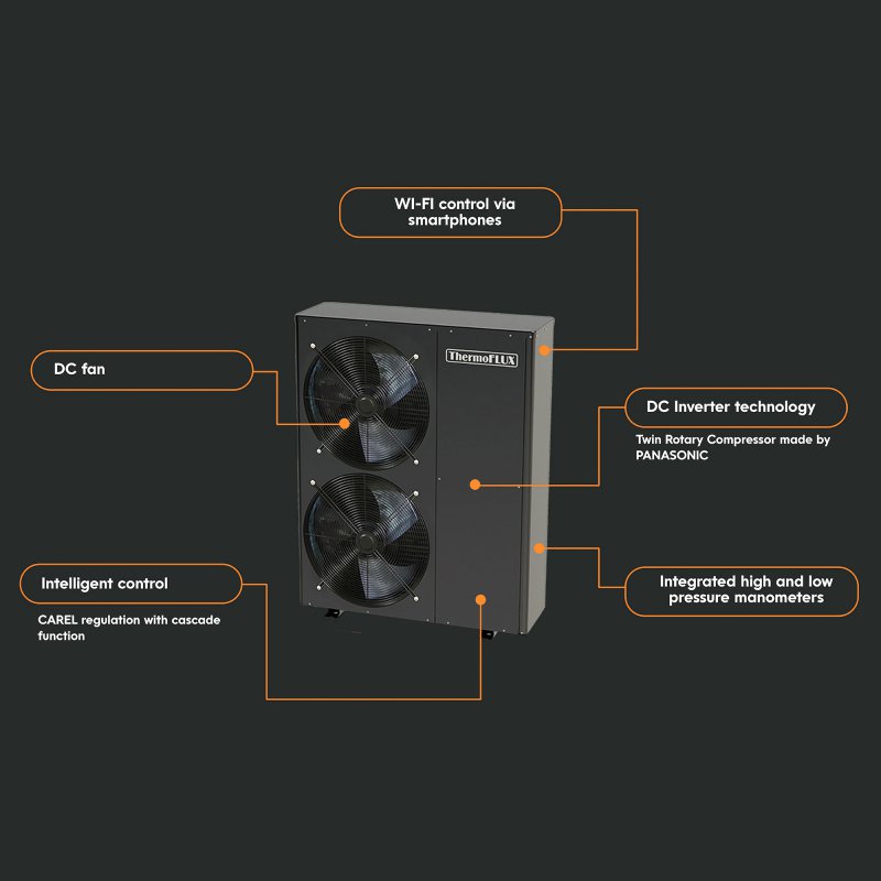 Inverter-Luft-Wasser-Wärmepumpe der neuesten Generation für Außentemperaturen bis zu -20°C. Unsere Wärmepumpe der Klasse A+++ (siehe europäische Gesetzgebung zur Energieeffizienz) tragen wesentlich zur Einschränkung der Umweltbelastung bei, wodurch erhebliche Energieeinsparungen und eine Senkung der Betriebskosten erzielt wird. Durch den verbauten Panasonic Kompressor und der DC-Inverter Technology wurde eine erhebliche Geräuschreduzierung zu anderen vergleichbaren Luft-Wasser-Wärmepumpen erzielt. Kältemittel R410A für höchste Effizienz. Durch die Smart-Steuerung mittels Handy-App können Sie die Luft Wasser Wärmepumpe von überall aus überwachen und bedienen.